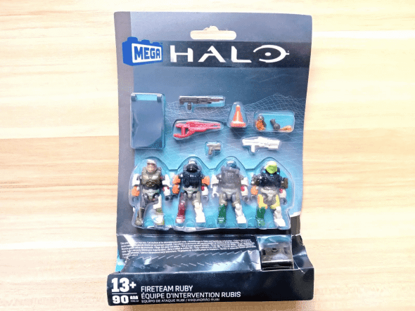 First pack, Fireteam Ruby. The flag shows the Block poster matching the UNSC Arctic Burn Wasp above the figures. It's hard to see because of the glare, but we can see a Pulse Carbine in crimson, a Sidekick Pistol, a Commando Rifle, a Hydra, various Frag Granades, a few smaller pieces, and the all-important orange cone.
